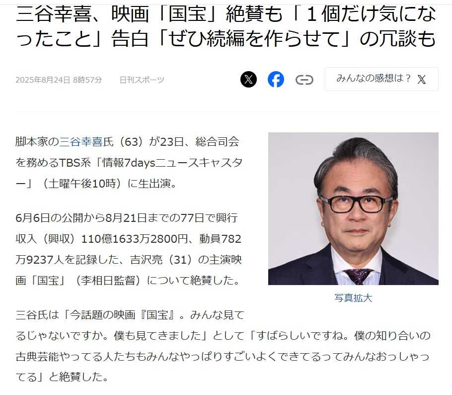 <■三谷幸喜、映画「国宝」絶賛も「1個だけ気になったこと」告白「ぜひ続編を作らせて」の冗談も>2025年8月24日