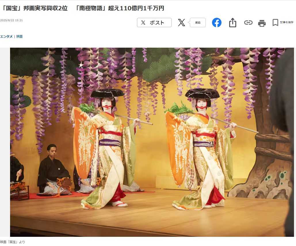 <■「国宝」邦画実写興収2位 「南極物語」超え110億円1千万円>2025/8/22 15:21