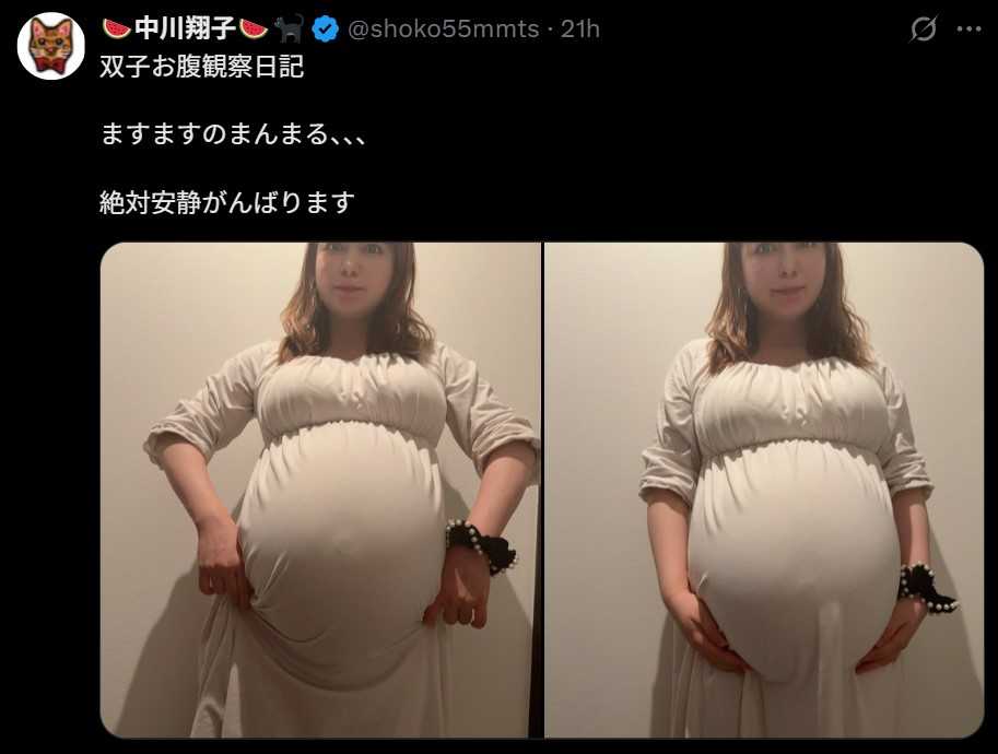 <■双子妊娠中の中川翔子 まん丸おなかの最新ショット披露「胎動のおかげで大変さすら楽しめてる気がする」>