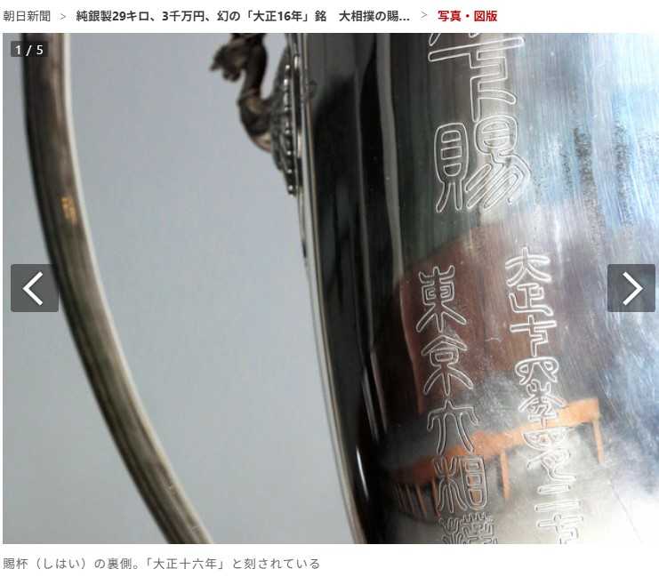 ・大相撲の優勝杯「賜杯(しはい)は天皇賜杯を指すことが多く、純銀製のカップでで、制作日は大正16年4月29日。