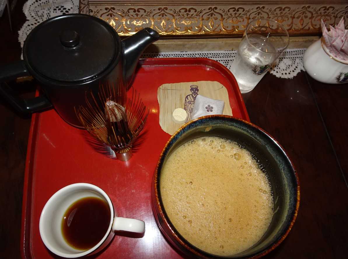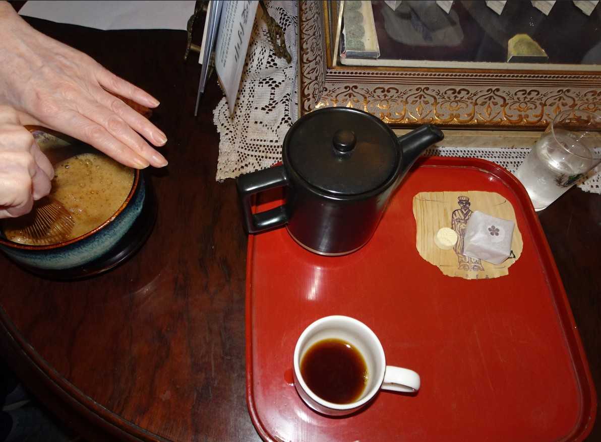 コーヒーを泡立てたのではないかと推測し、茶道家でもある奥様が茶筅をさっと回し、やわらかくまろやかなコーヒーをいただきます。