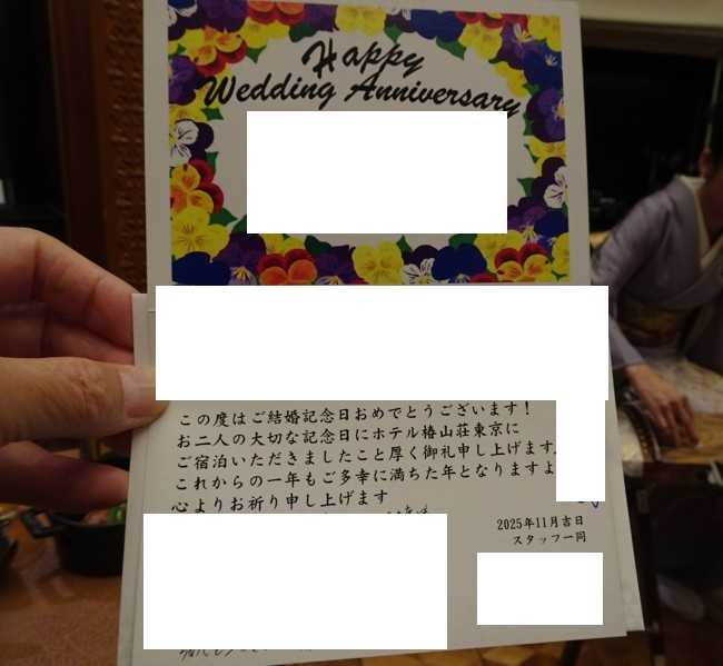 そしてサプライズ、我々の結婚記念46回が紹介され、中島みゆき「糸」が演奏され、ホテルスタッフの方々のお祝いメッセージの寄せ書きが手渡されます。