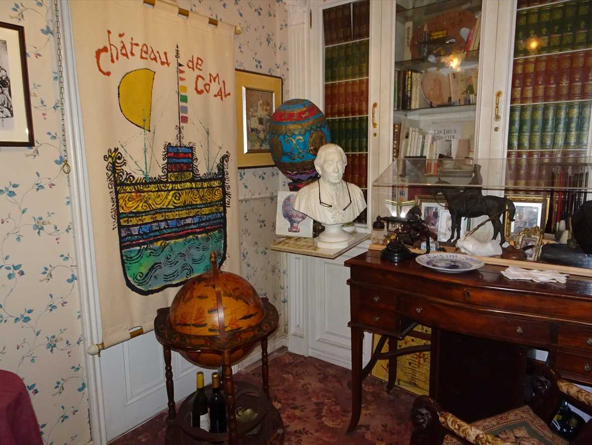 2021年2月4日の日経新聞に掲載された、千葉県柏市にある「コーマル城」(CHATEAU DE COMAL)。いつか行きたいと思いつつ、やっと実現、正式名称は「シャトー・ド・コーマル」です。学問の神殿の次は、「書斎と図書の間」です。左の壁には、コーマル城で展覧会を開催したときに制作された早川義孝氏のタペストリーがかけられ、机の上には、黒田長久氏の形見分けとして贈られた、北村西望氏作の閑院宮の騎馬像が置かれています。中央の書棚にはコーマルアカデミーのメンバーから寄贈された本が展示されています【今日のLifeHack:自分の悪印象は堅い梅の木でできた数珠のように、こすってもこすっても生涯にわずかしか減ってゆかない、樹木希林】