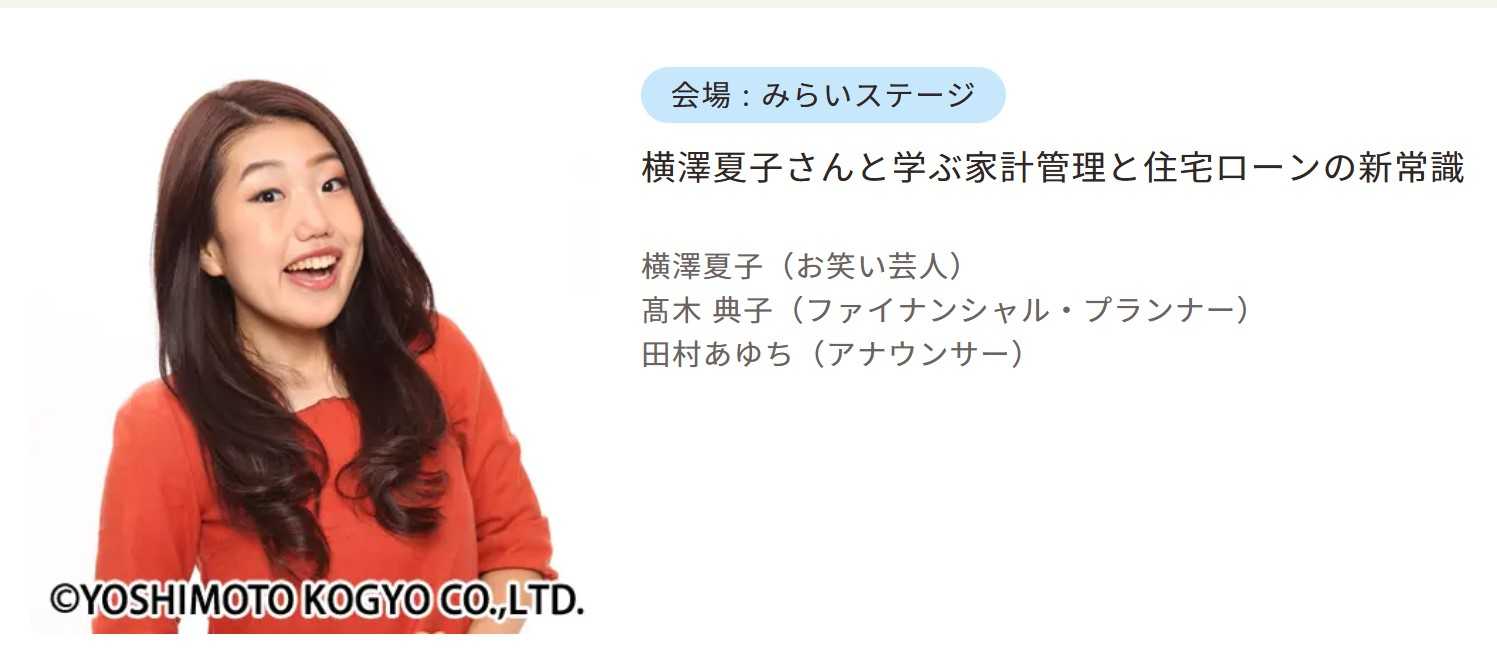 東京ビッグサイトで開催の「GOOD LIFEフェア2025」「みらいステージ」の「西1ホール」で開催される「つながるセミナー」小島よしおさんに続いて、横澤夏子さんの登場です。司会は田村あゆちアナウンサー、講師はJ-FLEC認定アドバイザ―/ファイナンシャル・プランナーの髙木 典子さん、テーマは「家計管理と住宅ローンの新常識」です。・横澤夏子さんは三人の子どもの子育て中。・ファイナンシャルプランナーが物価高に備える家計管理のコツ(支出の分類等)彼女自身、支出の管理、特に一定料金の「サブスク」の管理について、大変今日深く聞き入っていました。・・・・・・・・・・・・・・・・・・・・・・・・・・・・・・・・・・・・・・・・<■横澤夏子>横澤 夏子(よこさわ なつこ、1990年〈平成2年〉7月20日[2] - )は、日本のお笑いタレント。吉本興業東京本社(東京吉本)所属。東京NSC15期生。愛称は、なっちゃん。<略歴>東京都墨田区錦糸町に生まれ、新潟県糸魚川市で育つ。小・中(糸魚川東中学校)・高校時代にそれぞれ生徒会副会長を務めた。とにかく目立ちたいという理由からで、芸人を目指したきっかけも同様の理由である[5]。芸人を志す以前は「生徒からすると、学校の先生は芸能人」ということから教師を志望していた。中学3年生のときにルミネtheよしもとにてお笑いライブを初観劇[7]。タカアンドトシに衝撃を受け、お笑いコンビとして初めて好きになる。『エンタの神様』(日本テレビ)のスペシャル回にて、東京ビッグサイトで1万人の客を前に漫才を披露するタカアンドトシを見て「学校の先生よりも目立てる職業があるんだ」と初めて認識する。これをきっかけに教師への目標が芸人へと変わっていった。また、憧れのお笑いタレントは上沼恵美子。<人物>身長172cm、血液型A型[2]。卓球で県大会優勝。ベビーシッターの資格を保有する。アルバイトでベビーシッターのほか、観光バスの添乗員など、20から30の職を経験。こうしたアルバイト経験も、1人芸を磨くきっかけになったと話している。・・・・・・・・・・・・・・・・・・・・・・・・・・・・・・・・・・・・・・・・【今日のLifeHack:私は「なんで夫と別れないの」とよく聞かれますが、私にとってはありがたい存在です。ありがたいというのは漢字で書くと「有難い」、難が有る、と書きます。人がなぜ生まれたかと言えば、いろんな難を受けながら成熟していくためなんじゃないでしょうか、樹木希林】