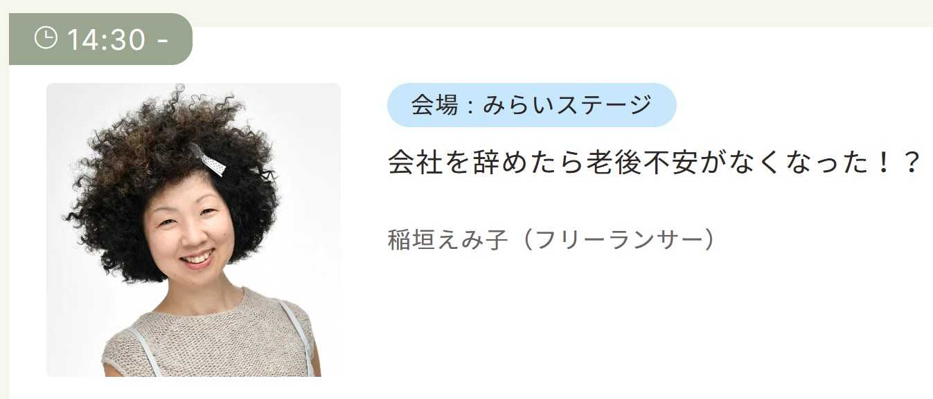 東京ビッグサイトで開催の「GOOD LIFEフェア2025」「みらいステージ」の「西1ホール」で開催される「つながるセミナー」です。料理愛好家・シャンソン歌手の平野レミさに続いて、フリーランサーの稲垣えみ子さん。テーマは「会社を辞めたら老後の不安がなくなった!?」です。名前を見ても分かりませんでしたが、ヘアースタイルが独特で、一度見たら忘れられません。彼女は、元朝日新聞社の記者・編集委員でしたが、50才で退職し、現在60才で都内在住です。・老後不安0。・自転車で行ける範囲? での生活 渋谷近く。・50で辞めて、60歳快適!・ジーンズの生活20年 洗濯機ないその方がジーンズの価値がある?、 メキシコ行った貝がアクセサリー。・ 高度成長 朝日新聞、新聞記者時代、上に行くと厳しい査定。60までキツイ!・現在還暦60才。・香川時代の低山登山が趣味。・東日本大震災の時の気づき 節電、家電を手放す、掃除機、レンジが無くてもやっていける、確信し現在に至る。・冷蔵庫も辞めた、食事は、1日500円 2万あれば食べられる。・生きていくなかで引っ越し 安い 洋服、本手放す。・古本屋が本棚、古着屋さん クローゼット、ガス契約もやめて銭湯、・街が我が家、街の人、仲良く いい人に囲まれていきてる。ないのは、資源。自由に生きていると無くても大丈夫。【今日のLifeHack:人がやらない役をやらしていただいてるから、食いっぱぐれがない、樹木希林】