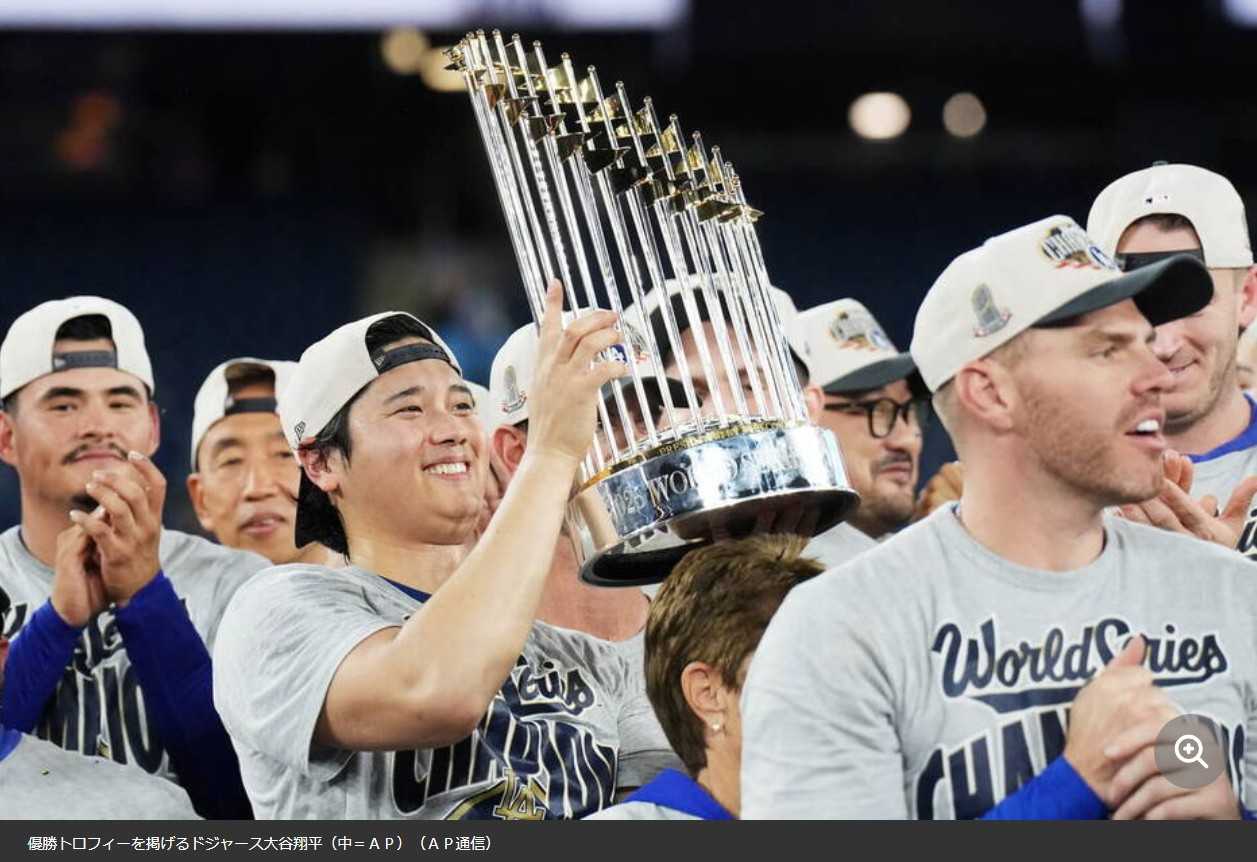 大リーグのワールドシリーズ、2連覇を果たしたドジャース、またまた、やりました。おめでとうございます!。ここでテレビに映し出されたのが、優勝トロフィー!目白「椿ホール」で開催される「ダーバン&アクアスキュータム」バーゲンでいつも目の当たりにしているあのトロフィーのレプリカを思い出します。大きさ、色艶、質感、輝き・・雰囲気は分かります。昨年に続いて、連覇!おめでとうございます!・・・・・・・・・・・・・・・・・・・・・・・・・・・・・・・・・・・・・・・・<■ワールドシリーズV2ドジャースがロサンゼルス凱旋 MVP山本由伸が優勝トロフィー掲げる 4日パレード>2025/11/3 10:37(最終更新 11/3 13:38)ワールドシリーズ(WS)2連覇を飾ったドジャースが2日(日本時間3日)、ロサンゼルスへ凱旋した。 ドジャースは前日1日(同2日)に敵地のカナダ・トロントで行われたWS第7戦でブルージェイズを延長11回の末に5―4で破り、4勝3敗として21世紀初となる連覇を達成。9回途中から連投でシリーズ3勝を挙げた山本由伸投手がMVPに輝いた。 ナインを乗せたトロント発のチャーター機は2機で、現地午後5時(日本時間3日午前10時)過ぎに相次いでロサンゼルス空港に着陸。偉業を祝福するウオーター・サルートをくぐった機体が止まり、選手やコーチ陣が姿を見せるとファンの熱狂的な声援が出迎えた。MVPの山本はWS制覇のトロフィーを頭上に掲げてタラップを降りた。 球団の公式インスタグラムは機内の様子を公開。WSの大きなトロフィーを抱え笑顔の大谷翔平投手や佐々木朗希投手の写真をアップした。さらに抱えたままスヤスヤ眠る山本の写真も披露した。 ドジャースは3日(同4日)にロサンゼルス市内で優勝パレードを行う。パレードは午前11時(同4日午前4時)に始まる予定で、その後ドジャースタジアムで優勝報告会が行われる。・・・・・・・・・・・・・・・・・・・・・・・・・・・・・・・・・・・・・・・・【今日のLifeHack:これからは根をしっかり張った人しか生き残れないでしょうね、樹木希林】<トロフィーを掲げて飛行機から降りる山本由伸(ドジャース公式インスタグラムより)>