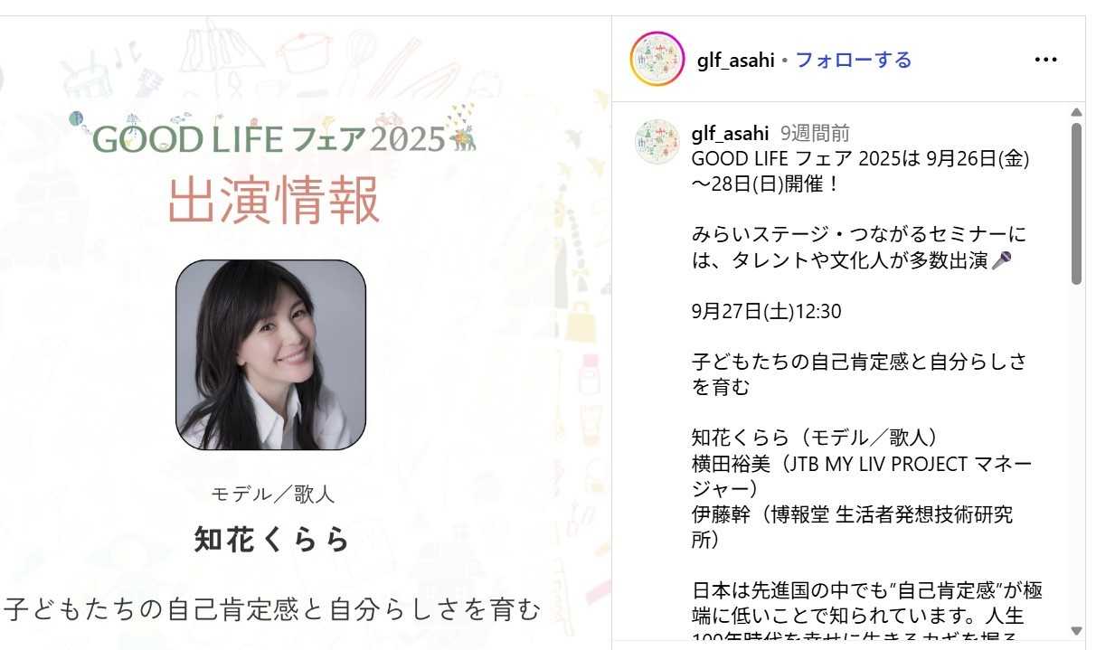 東京ビッグサイトで開催の「GOOD LIFEフェア2025」「みらいステージ」の「西1ホール」で開催される「つながるセミナー」、二日目です。京都府立医科大学の内藤裕二教授、サッカー元日本代表の鈴木啓太さん、お二人に続いて、モデルで歌人の知花くららさんの登場です。彼女は、2006年7月、第55回ミス・ユニバース2006世界大会で第2位を受賞されています。テーマは「子どもたちの自己肯定感と自分らしさを育む」です。・自己肯定感、ウェルビーイング、弱さを受け入れること。・諦めると心が楽になる。・短歌との出会いで、客観視ができ、短歌に救われた。・2級建築士の免許あり。・国連関連でネパールやスリランカで活動、ちぢれ毛の彼女等に、日本人女性の直毛に触れさせたら、こっちのもの、関係が近くなる。とも話されていました。・・・・・・・・・・・・・・・・・・・・・・・・・・・・・・・・・・・・・・・・<■知花くらら>1982年、沖縄県生まれ。モデルとして数多くの女性誌で活躍。国連WFPの日本大使を務める。最新情報は公式インスタグラム(chibanakurara.official)にて。<CHIBANA’S History>知花さんのこれまでヒストリー2006 上智大学文学部教育学科卒業ミス・ユニバース2006世界大会で第2位2007 WFP(国際連合世界食糧計画)オフィシャルサポーターに就任2008 女性誌の表紙を務めるなど、モデルとして活躍2009 栄養学を学ぶために短大に入学したものの、のちに退学2013 WFPの日本大使に就任2015 NHK大河ドラマにて女優デビュー2017 結婚・第63回角川短歌賞で佳作を受賞2019 京都芸術大学建築科の社会人課程に入学、/妊娠中に大学生活スタート!\第1子出産2021 大学を卒業・第2子出産・・・・・・・・・・・・・・・・・・・・・・・・・・・・・・・・・・・・・・・・【今日のLifeHack:色っぽいというのはバラの花をくわえて髪の毛をかき分ける仕草だとか、極端に言えば、しどけないのが色っぽいというのではなくて、慎ましくて色っぽいというのが女の最高の色気だと思います、樹木希林】