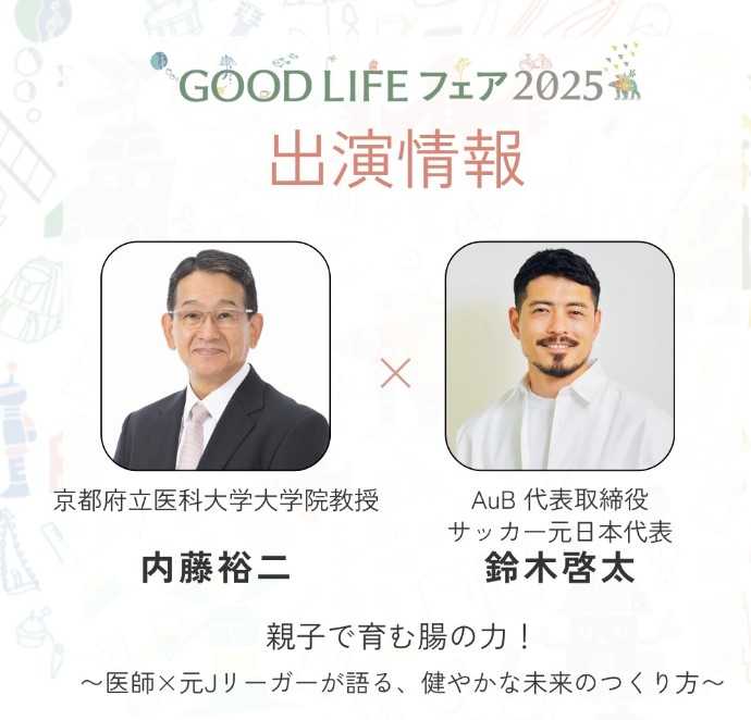 東京ビッグサイトで開催の「GOOD LIFEフェア2025」「みらいステージ」の「西1ホール」で開催される「つながるセミナー」、二日目です。京都府立医科大学の内藤裕二教授、サッカー元日本代表の鈴木啓太さん、お二人の登場です。テーマは「親子で育む腸の力」です。腸は“第二の脳”と呼ばれ、健康やパフォーマンスに深く関わります。そんな胃腸(ガット)の虚弱=「ガットフレイル」は、子どもから働き盛り世代まで影響を及ぼす重要なテーマです。このセミナーでは、腸内環境の第一人者・内藤裕二先生と、アスリートの腸内細菌研究を通じて、一般の方々への商品・サービスの開発や販売を行うブランド「aub」を運営している元サッカー日本代表・鈴木啓太さんが登場desu.・元Jリーガー鈴木氏は引退して10年、腸活な励んでいる。・ガットフレイルとは胃腸の動きの虚弱化。・寝る前3時間以内の飲酒はダメ。・ある南の島の住民は、タンパク質を摂取せずにサツマイモしかたべず、筋骨隆々。・先生が食べるのは、海藻、大豆、魚、芋、根菜類が主。・観弁、毎朝弁をよく観る。・朝起きたら歯を磨き、口の中の菌を外に吐き出し、きれいにしてから白湯など水を飲む。・人生の目標、生きがいが大事。<セミナー当日、2015/9/27の朝日新聞に掲載>・バナナの様な便が理想的で、回数は週に2~3回でも大丈夫。・根菜類・豆類・全粒粉など植物繊維は一日350g。・京都丹波で食べられる食材「ま・ご・わ・や・さ・し・い・よ」(豆類、胡麻。ワカメ、野菜、魚、椎茸、芋、ヨーグルト)【今日のLifeHack:どの夫婦も、夫婦となる縁があったということは、このマイナス部分が必ず自分の中にもあるんですよ、樹木希林】