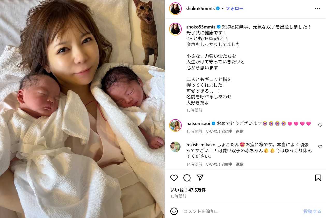 昨日、9月30日、9時30分頃にタレントの中川翔子さん(40)が、双子を出産したことを発表しました。おめでとうございます!赤ちゃん2人とも2600越えとのこと、驚きです。我が家の初めての子・長女は一人で3kg強でした。母子ともにお元気で良かったです。40歳を超えてのお母さん、更に双子とのこと、何かとご苦労も多いと思いますが、健やかに育つことを祈っております。FM ilovecb・・・・・・・・・・・・・・・・・・・・・・・・・・・・・・・・・・・・・・・・<■40歳・中川翔子が双子の男児出産を発表 2人とも2600g超え…産声に感動「人生かけて守っていきたい」>9/30(火) 16:01 ENCOUNT配信中川は「9:30頃に無事、元気な双子を出産しました!」と出産を報告。「母子共に健康です! 2人とも2600g越え! 産声もしっかりしてました」と自身、そして生まれてきた双子も元気であると明かした。「小さな、力強い命たちを人生かけて守っていきたいと心から思います」 ベッドの上で双子を抱き寄せた写真とともに、「二人ともギュッと指を握ってくれました 可愛すぎる、、!」と愛情を爆発。「名前を呼べるしあわせ。大好きだよ」と感動の言葉をつづった。 中川は2023年4月に同年代の男性との結婚を発表し、40歳となった今年5月5日に妊娠を発表。今月に入り子どもが双子であり、性別が2人とも男の子であることを公表していた。ENCOUNT編集部・・・・・・・・・・・・・・・・・・・・・・・・・・・・・・・・・・・・・・・・【今日のLifeHack:不安定さからくる「かわゆさ」も、身軽さからくる悲しさも、不自然さからくる迫力もみんな、女優としての魅力になる、樹木希林】<中川翔子さんのインスタグラム、「2人とも2600g越え!」生まれたばかりの双子男児と中川翔子の3S><我が家の初めての子・長女は一人で3kg強、今は既にしょこたんの年齢を超え><椿山荘の風鈴>