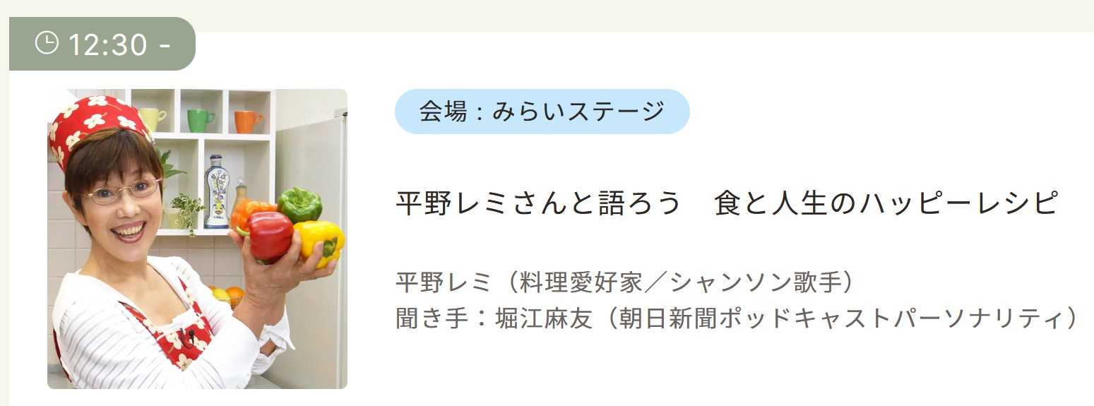 東京ビッグサイトで開催の「GOOD LIFEフェア2025」「みらいステージ」の「西1ホール」で開催される「つながるセミナー」です。山田邦子さんに続いて、料理愛好家・シャンソン歌手の平野レミさん。テーマは「食と人生のハッピーバーレシピ」です。黒字に花柄のTシャツと、白地のパンツでで登場。ホンモノを目の当たりにするのは、初めてです。エプロン姿でない彼女を見るのも、初めてです。シャンソン歌う彼女を観たのも、初めてです。御年78歳とは思えないパワー、軽快でおしゃれなトーク、テレビで観る平野レミさん、そのままです。亡きご主人 和田誠さんの事も。「和田さん死んじゃったのよね。その時人って死ぬんだって本当にわかったの。だから小さなこと気にしないで素直に楽しくしないとね」と。・前日のモニタリング「ホタテどっちのレシピ」を見ましたか?と。→見ました!。・息子の結婚前、嫁になる上野樹里を紹介されて彼女を知らずに、上野樹里も平野レミを知らなかった様で、互いに知らない「ウィンウィンだ」、と。・平野の得意料理は、「牛トマ」、完熟トマトと、牛ロースの料理。・死ぬ前、最後に食べたいのは、おにぎり。出産時に、達成感を感じ食べたから、だそうです。【今日のLifeHack:内田さんとは一緒の方向を見ていると感じることができるの。ゲリラ的な、モノを破壊したくなるという気持ちを共有できる、同士みたいなもの】