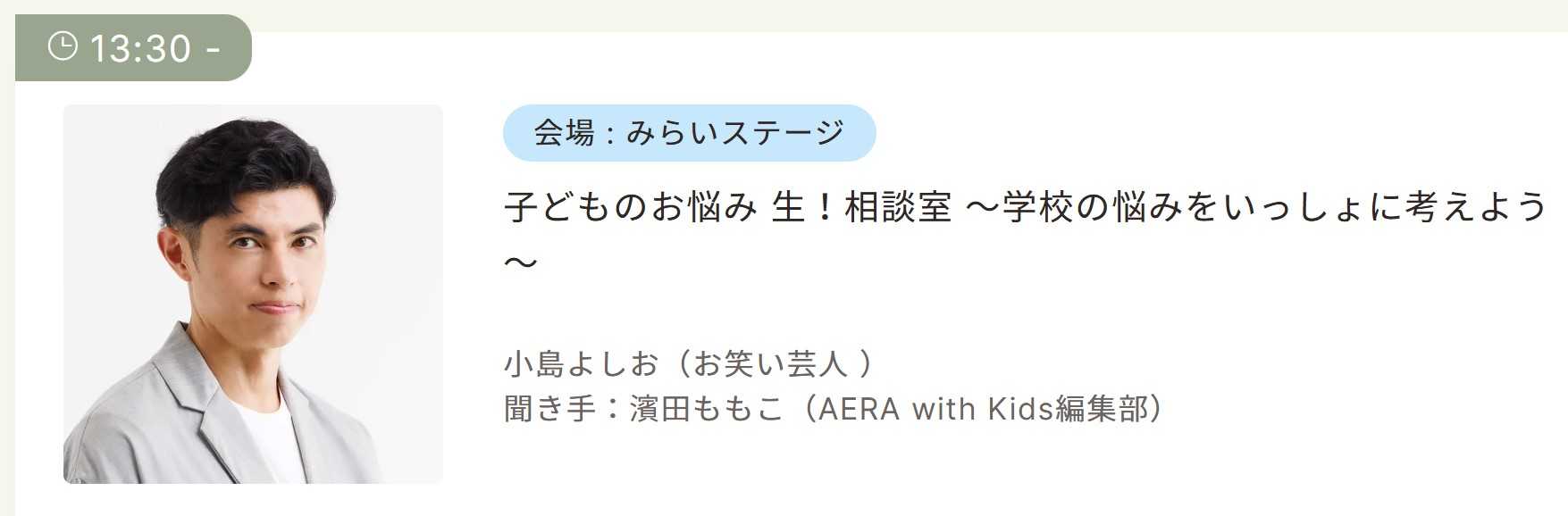 東京ビッグサイトで開催の「GOOD LIFEフェア2025」「みらいステージ」の「西1ホール」で開催される「つながるセミナー」モデルで歌人の知花くららさんに続いて、小島よしおさんの登場です。そう、「そんなの関係ねぇ」や「オッパッピー」のギャグで有名なあの方です。テーマは「子どものお悩み 生!相談室」です。・小島氏は今年45歳。・小学校の勉強で覚えるのは虫取りと同じ、繰り返しが大事。・本を読む、好きなジャンルから。お勧めは、星新一、イナガキ、昆虫のイナガキ。・比べることをやめる、「ピーヤ」、比止を流行らせる。・・・・・・・・・・・・・・・・・・・・・・・・・・・・・・・・・・・・・・・・<■小島 よしお(こじま よしお>1980年(昭和55年)11月16日 - )は、日本のお笑いタレント、登山家。本名及び旧芸名、小島 義雄(読み同じ)。サンミュージックプロダクション所属。欧米アジア語学センター校長。身長178 cm、体重70 kg[2]。血液型O型。既婚。1児の父。・・・・・・・・・・・・・・・・・・・・・・・・・・・・・・・・・・・・・・・・【今日のLifeHack:子どもの時に他人と比較する無意味さを知った、樹木希林】<facebook>https://www.facebook.com/kojimayoshioofficial/videos/aera-with-kids-%E5%AD%90%E3%81%A9%E3%82%82%E3%81%AE%E3%81%8A%E6%82%A9%E3%81%BF%E7%94%9F%E7%9B%B8%E8%AB%87%E5%AE%A4%E5%AD%A6%E6%A0%A1%E3%81%AE%E6%82%A9%E3%81%BF%E3%82%92%E3%81%84%E3%81%A3%E3%81%97%E3%82%87%E3%81%AB%E8%80%83%E3%81%88%E3%82%88%E3%81%86%E3%81%A7%E7%94%9F%E3%81%8A%E6%82%A9%E3%81%BF%E7%9B%B8%E8%AB%87%E3%82%B3%E3%83%BC%E3%83%AB%E3%83%AC%E3%82%B9%E3%83%9D%E3%83%B3%E3%82%B9good-life-%E3%83%95%E3%82%A7%E3%82%A2-2025%E5%8F%AB%E3%82%93%E3%81%A7%E6%82%A9%E3%81%BF%E3%82%82/1527835348207598/