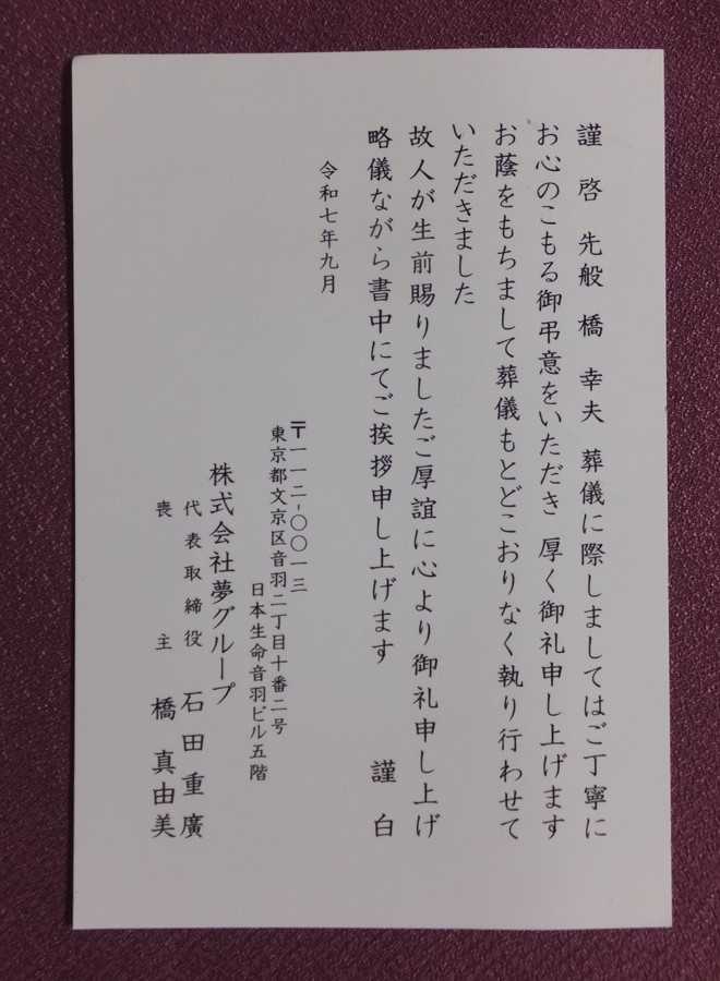 喪中はがきが届きました。差出人は、夢グループの石田重廣社長と、橋真由美様。はじめ分かりませんでしたが、よく見ると、夢グループの社長と、橋幸夫さんの奥様です。そう、先日葬儀・告別式に参列しましたが、新たな年の喪中のご挨拶状です。心からお見舞い申し上げます。【今日のLifeHack:昔はたとえチョイ役で出た作品だったとしても、的外れな評価をされれば、その人の首根っこ掴んで「この映画はこういうことなんだよ!」って言わずにいられない性分でした、樹木希林】<橋家からの喪中はがき>