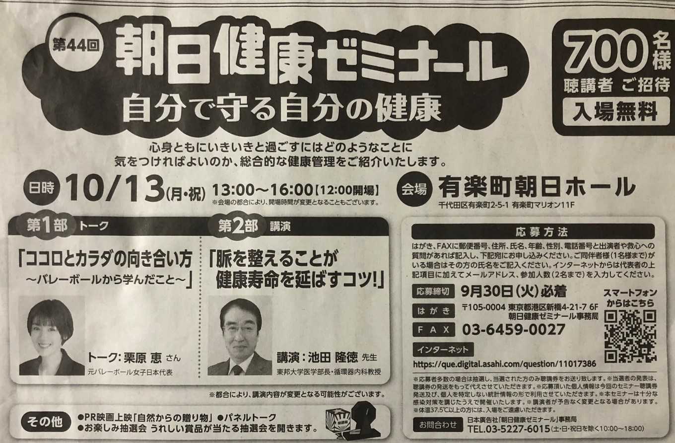 「スポーツの日」は、またまた抽選に当たり、有楽町で、元バレーボール女子日本代表・栗原恵さんのセミナーです。会場は有楽町朝日ホールです。いつもの様に開場1時間前に到着し、列に並び、最前列で聴講します。<■栗原恵セミナー>ココロとカラダの向き合い方。・限界を見極めると、無理をするは別。・32歳で脳血栓を発症。広島から水戸まで見舞いに来た母が「命を無駄にするな」と怒り!。・息子が生まれてからは体と対話するように。今、息子は9ヶ月。・一期一会、今日試合を見に来た人は、もう来ないかも知れないので、全力を尽くす。・ファスティングを始めた。単なる断食ではなく、一定期間固形物を摂取せずに消化器官を休ませ、身体の内側からリセットを図る健康法。<■池田隆徳東邦大学教授>脈を整えることが健康寿命を延ばすコツ!・脈を整えるのが、長生きのコツ。男性81.05歳(健康寿命72.57歳)、女性87.09歳(健康寿命75.45歳)・健康を重視した徳川家康は75歳、伊達政宗は70歳まで生きた。・納豆、味噌汁、ご飯、を基本に、青魚が良い、秋刀魚、鰯、鯖、シラスも。お酒は個人差があり、がんまーGTPが高くなければ良い。<γ-GTP(ガンマ-GTP)>肝臓や胆道などの障害を調べるための血液検査項目である酵素。肝臓の解毒作用に関わり、肝臓や胆管に異常があると血液中に漏れ出て数値が上昇。主な原因として過度な飲酒が挙げられるが、その他にも薬剤や脂肪肝、胆石、胆管炎などでも高値となる。γ-GTPA判定: 50 U/L 以下B判定: 51-80 U/LC判定: 81-100 U/LD判定: 101 U/L 以上、γ-GTPは「50以下」なら正常。・趣味等、人生を楽しむのが健康に良い、秘訣。今日もホンモノを目の当たりに出来ました。万歩計は、一万歩を超えて・・・【今日のLifeHack:私にとって芸能人という職業もまた、己自身を見出す職業だと思っています、樹木希林】