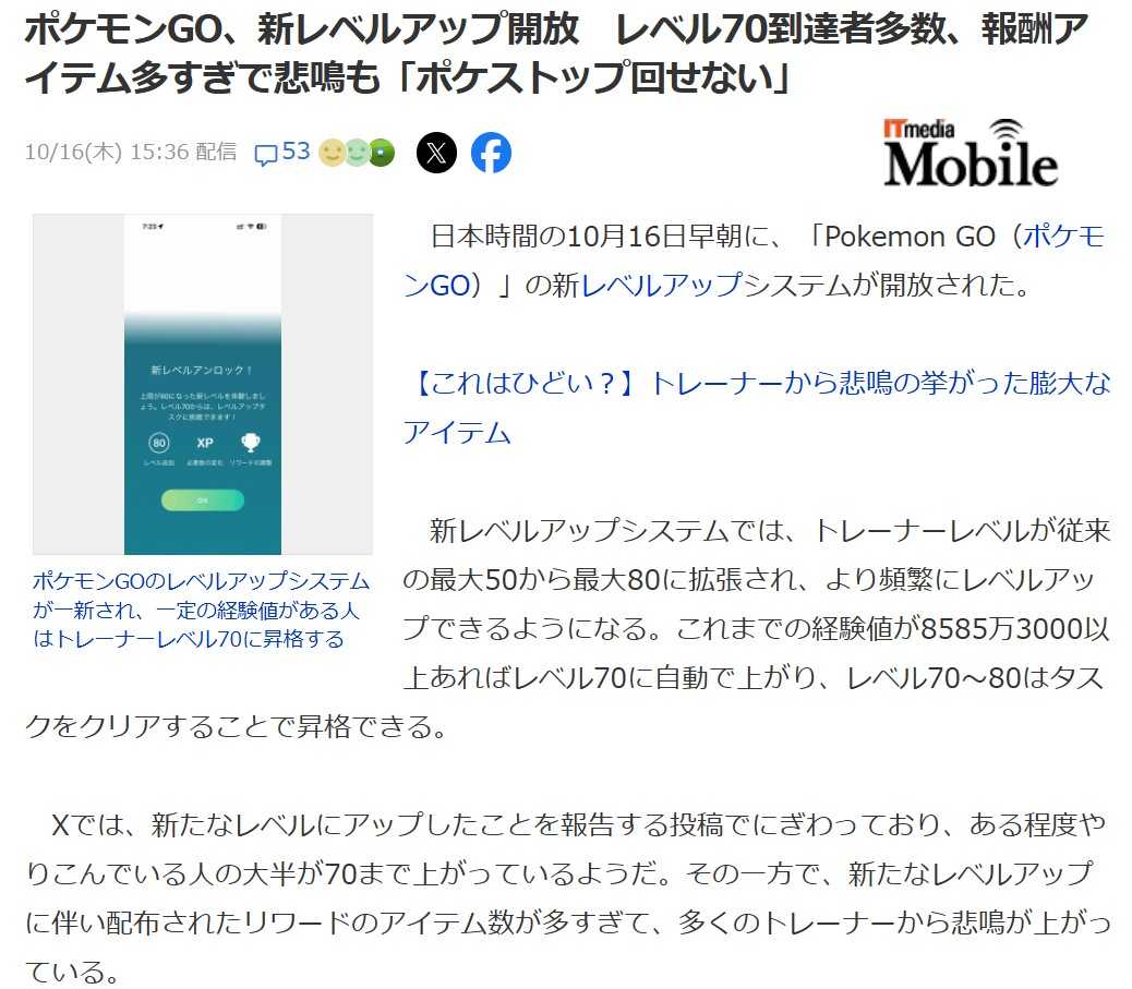 10月16日に、ポケモンGOの、新レベルアップが開放されました。すると、突然、私のポケモン・レベルが45から69に上がりました。友人は42から60に上がり、驚いていました。これから、どんな進化を遂げるのでしょう・・・楽しいやら、恐ろしいやら・・・・・・・・・・・・・・・・・・・・・・・・・・・・・・・・・・・・・・・・・・・<■ヤフーニュース>ポケモンGO、新レベルアップ開放 レベル70到達者多数、報酬アイテム多すぎで悲鳴も「ポケストップ回せない」10/16(木) 15:36 ITmedia Mobile配信ポケモンGOのレベルアップシステムが一新され、一定の経験値がある人はトレーナーレベル70に昇格する 日本時間の10月16日早朝に、「Pokemon GO(ポケモンGO)」の新レベルアップシステムが開放された。【これはひどい?】トレーナーから悲鳴の挙がった膨大なアイテム 新レベルアップシステムでは、トレーナーレベルが従来の最大50から最大80に拡張され、より頻繁にレベルアップできるようになる。これまでの経験値が8585万3000以上あればレベル70に自動で上がり、レベル70~80はタスクをクリアすることで昇格できる。 Xでは、新たなレベルにアップしたことを報告する投稿でにぎわっており、ある程度やりこんでいる人の大半が70まで上がっているようだ。その一方で、新たなレベルアップに伴い配布されたリワードのアイテム数が多すぎて、多くのトレーナーから悲鳴が上がっている。 どういうことか。筆者は、トレーナーレベル70に上がったが、その際に配布されたアイテムや報酬は以下の通り。・モンスターボール キャップ×1・モンスターボール シューズ×1・モンスターボール ジャケット×1・スーパーボール キャップ×1・スーパーボール シューズ×1・スーパーボール ジャケット×1・ハイパーボール キャップ×1・ハイパーボール シューズ×1・ハイパーボール ジャケット×1・マスターボール×1・ポケモンボックス+150・道具バッグ+250・ギフトの保管スペース+15・ポストカードのページ+150・すごいわざマシンスペシャル×1・ほしのかけら×7・しあわせタマゴ×15・ルアーモジュール×8・おこう×15・スーパーふかそうち×3・ふかそうち×16・げんきのかたまり×195・まんたんのくすり×370・ハイパーボール×575・パイルのみ×250・ズリのみ×95・ナナのみ×90 道具バッグは+250拡張されたが、配布されたアイテム数はのべ1600を超えるので、ボックスを大幅に圧迫してしまう。Nianticは新しいレベルアップシステムの告知で「自分の調整後のトレーナーレベル以前で受け取れる新たな『着せ替えアイテム』とボックス関連のリワードは、さかのぼって受け取れます」と説明しており、トレーナーレベル70以前でもらえる報酬も、さかのぼって受け取れるようだ。 道具バッグがいっぱいだとポケストップを回せず、ギフトを入手したり、デイリーボーナスの連続スピンを達成したりできなくなる。 トレーナーからは「ボックス溢れ過ぎてポケストップ回せないんだが」「一生回せないポケストップ(道具満杯)」「道具増えすぎてポケストップ回せなくするのはおかしい」「アイテムテロだ」など困惑の声が挙がっている。 「どうせ捨てなきゃならないんだったら道具箱1000もらった方が嬉しいわ!」という声も挙がっている。中には、これを機に、道具バッグを購入させようとたくらんでいるのでは、という見方をする人も。道具バッグは、空きスペースを50増やすのに200ポケコン必要なので、1000規模で増えた道具を保管するには4000以上のポケコインが必要になる。すぐに使う必要のない道具は捨てておくのが賢明だろう。 道具バッグを圧迫するもう1つの弊害として、対人戦の「GOバトルリーグ」を進められないことも挙げたい。GOバトルリーグでは1セットのうち2勝すると、報酬としてアイテムをもらえるが、道具バッグがいっぱいだともらえない。報酬をもらわないと次のバトルに進めないため、道具を捨てる必要がある。筆者もここでつまずき、結局、もらったまんたんのくすりやハイパーボール、各種きのみを捨ててしまった。 さすがに1000規模で道具が増えるのは、ユーザーフレンドリーではないだろう。しばらくは、道具を捨てることに頭を悩ませるトレーナーが増えそうだ。<レベル71~80に必要なタスクを確認できる> トレーナーレベル71以降の到達に必要なタスクは、「自分」タブのレベルが記載された画面の双眼鏡アイコンをタップすると確認できる。その際、各レベルの到達でもらえるアイテムも記載されている。また、画面下部を左右にスクロールすると、他のレベルの達成でもらえる報酬や、レベルアップに必要なタスクも確認できる<毎日受け取れる「すぐふかタマゴ」が登場> 新レベルアップシステムでは、毎日受け取れる「すぐふかタマゴ」が登場。このタマゴは、通常のふかそうちとは異なる専用のふかそうちに入り、保持できるタマゴの数にはカウントされない。タマゴは1キロ歩くとかえり、翌日にログインすることで、別のすぐ