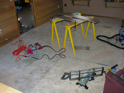 家のリビングのカーペットをPERGOというフローリングに替えることにしました。DIYのお店で材料やら道具やらを購入。そして現在進行中です。作業の一こまカーペットを剥ぎました。 フローリングやっている途中経過 外で夫が作業中。板のサイズの修正などしてます。 こんな感じでやってます。 今フローリング敷き詰め作業おわりました。これから、モールディングとかいう壁と板張りとの部分に飾りをするところまできました。板が呼吸をするそうで、決まったサイズをあけておき、そこで収縮が出来るようにします。その収縮部分と、板とカーペットや他の素材の床との間に安全対策と見た目とかあれこれの目的で作られたモールディングを埋め込む作業が待ってます。