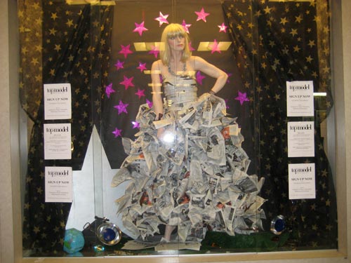 新聞紙で作ったドレスは、学生の集まる場に入る前のショーウィンドウのところにあり、映画やドラマでウィンドウに顔をこすりつけてドレスを見ている人を連想しながら通り過ぎました。