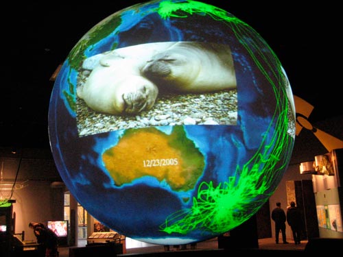 この時地球で何があった?というテーマの地球儀で日付と共に出来事が世界のあちこちでパノラマ写真で出てきたり、地震や台風などの自然災害の記号やお天気の記号昔学校の教科書に載っていたような?マークが出ていたりしました。