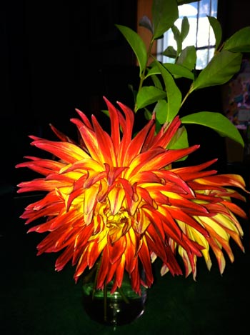 お客様がダリアの花を瓶にいけて持ってきてくれました。大ぶりな一りん咲きで夏の花火を思い出しました。お仕事はグラフィックデザイナー。広告や看板やロゴなどを作成しているほか、地元の新聞の広告といろんな学級案内コーナーのページレイアウトを手がけています。青い眼が奇麗な50代の女性でした。