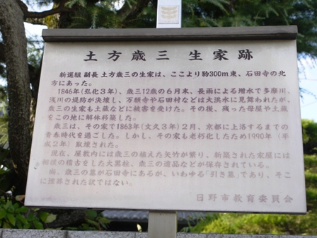 さて、高幡不動尊から副長の生家とお墓も近そうなので、歩いて向かったのですが...迷子になりました高幡不動駅まで戻って、モノレールでひと駅先の万願寺駅で降りました。ここから生家までは近いので、すぐ分かりました。毎週日曜日だけ内部を一般公開しているのですが、今日は月曜日なので門の外から写真だけ撮らせてもらいました。次に、お墓へ向かいます。道すがら住宅街の表札に目をやると土方姓が目立ちます。明治維新後しばらくは、このあたりに住んでいた人は、きっと肩身の狭い思いをしたのでしょう。そして、副長のお墓のある石田寺(せきでんじ)に着きました。七福神と一緒に局長と副長の写真も飾られており、ここに副長のお墓があるのは間違いないのですが...さて、どこにあるのでしょうだって、どこを見ても土方家の墓ばかりなんですよあっちこっちをうろうろして、やっと、小さい立札を見つけました。お墓の前には日野市教育委員会の看板も立っていました。向かって右側が副長のお墓で写真が飾られていました。合掌遺体が埋葬された場所は今でも謎ですが、函館のどこかであることは間違いなさそうです。ここから八王子までは当時を偲んで歩いて帰ろうかとも思ったのですが、途中でまだ8kmあると分かったので電車で帰りました。その3へつづく...