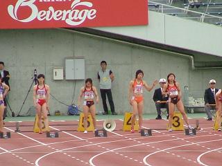 織田記念があってから半月経とうとしてるけど、はたして観戦記は書き終えることができるのだろうか?まあ、少しずつでも書かないとこのままなのでとりあえず第6回を書くことにします。前回の予告どおり女子100m決勝編です。予想どおり、みなセパレーツ、それも色が違うだけで皆同じ格好とは・・・。これが主流なんだろうけど、露出度高すぎます。ほんと、決勝はいいメンバーが揃いましたよ。3レーンはもう長年日本のトップを走ってる小島初佳選手、4レーンは昨年のインターハイチャンピオン高橋萌木子選手、5レーンは元インターハイチャンピオンでもある北風沙織選手、6レーンは200mの日本記録保持者・信岡沙希重選手、誰が勝ってもおかしくない感じです。風もいい感じで追っていますしね。結果・・・6レーンの信岡沙希重選手が11秒62で優勝しました。追い風0.9mだったからもう少しいい記録を・・・と思うのはぜいたくな望みでしょうか?そして優勝者がすることとはやっぱりこれ、花束を渡した小学生の背中にサインをしてました。さあ、次回は短距離以外の種目、となるわけですが、念のためないといってた男子100m決勝の画像をちょっとだけ。雨が降っていて前の人が傘をしてるうえに見事にピンボケしてしまったんですよ~。決勝の結果は日高一慶選手が追い風参考ながら10秒32で優勝しました。では、次回はいつになることやら・・・。