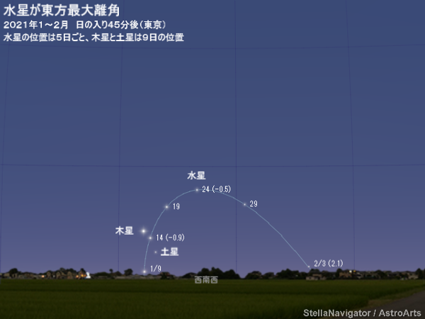 夕方の西南西の低空に見えている水星が、1月24日に太陽から最も離れて東方最大離角となる。