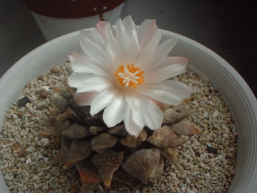 ベランダのサボテンの鉢の一つに花が咲きました。 「岩牡丹」だと思います。 全く世話らしい世話をしていないのにちゃんと咲いてくれました(葉の幾つかが赤茶けて変色しているのが気がかりです。世話をしていないからでしょう)。 季節は人の人生とかかわり無く、移って行くものですね。 年年歳歳花相似たり、歳歳年年人同じからず。 昔の風流な人は、菊の節句にちなんで盃に菊の花びらなどを酒盃に浮かべた様ですが、この花は止めておいた方が良いでしょう。 「烏羽玉」と同じく、このサボテン、幻覚作用があるようです。(一寸花を浮かべたぐらいだと関係ないけどね)。