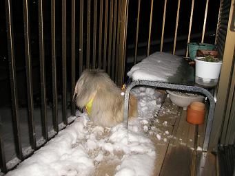 ひゃ~降りました!今日は、一日雪でした…そんな訳で散歩は、中止です。が…陸には、通用しません。またしてもベランダに出せと~出たは、いいのですが帰ってきません。30分は、ベランダに出ていました。まるで、除雪車のように雪を掻き分け大はしゃぎ!何故、ワンは雪が好きなのでしょうね?無駄な抵抗ですがエプロンを付けてみました。しかし、全身ビショビショです~明日、お出かけなのに…今日の陸。
