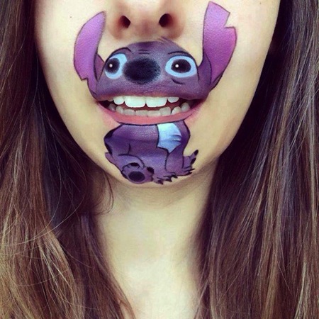 英国ロンドン在住のアーティストによるメイク。自分の唇とその周りに、人気キャラクターたちを描いた。