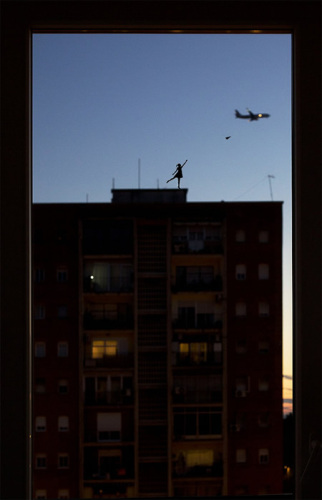 スペイン人アーティストによるシルエットアート。窓ガラスにカットされたイラストを貼り付けて、窓越しにリアルな風景の現実世界と組み合わせることで、ユニークなフォトアート作品を作った。ブランコに乗っていたり、紙ひこうきを飛ばしたりして、幻想的な世界のように見える。