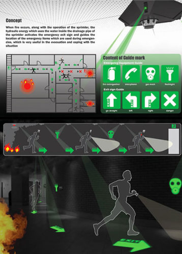 避難経路や必要アイテムを伝えてくれる火災サインシステム。建物で火災が起きた際に、天井から緑色の矢印を映し出し、非常口までの経路をちゃんと誘導されているし、消火器・ガスマスク・懐中電灯・非常電話などの保管場所でも知らせて、迅速に避難することができそう。
