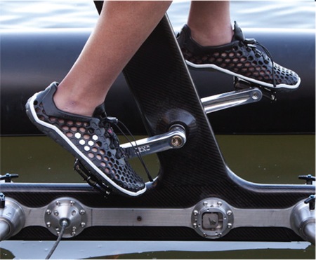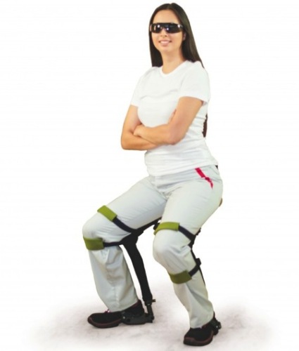 カーボンの軽量素材でできた下肢用外骨格「チェアレス・チェア」。電動可変ダンパーを備えて、決まった位置にくると、自動的に固定されていて、それを装着すれば、どこでも座れるようになる。重さ2kgで、1回の充電で8時間の可動が可能。