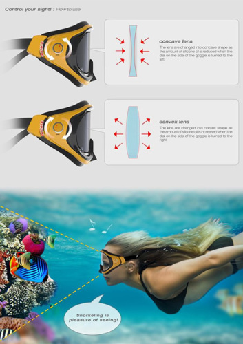 その中に近視レンズを持つ潜水鏡。右側のつまみを回すと、適切な度数に調整することができて、近視者でも美しい水中世界を満喫できるようになる。暗視レンズやカラーレンズなどに切り替えることもできて、潜水をもっと楽しくしてくれる。