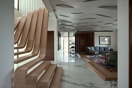 芸術品のように見える木製階段。室内に多くの日光を取り入れながら、美しくてインパクトが強い。