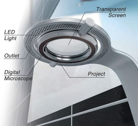 細菌を可視化にしてくれる蛇口。大きな円盤を持って、デジタル顕微鏡と円形スクリーンを搭載し、手の細菌をはっきりと表示されている。手が近づくと、自動的に水を流してくれて、多くの細菌があったら、LEDライトが赤色で点灯していて、水でキレイに洗うと、緑色になる。