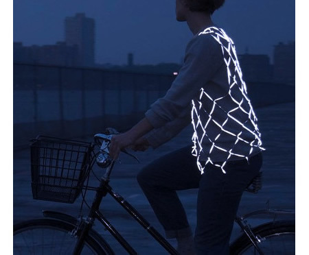 ニューヨークの工房で作られた手編みのベスト。反射材を取り入れたので、夜に光っていて、安全性を高めてくれる。伸縮性があり、どんな服の上でも着ることもできて、とっても使いやすい。非常に軽くて、耐久性が高く、夜のサイクリングなどで活躍できそう。