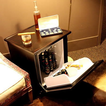 サイドテーブルに見えるが、中はミニ冷蔵庫になっていて、インテリアを損なわない。