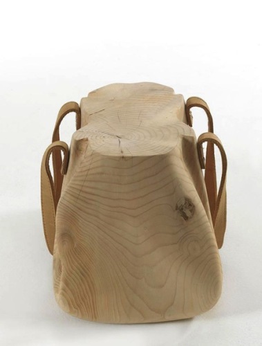 手提げバッグの形をした切り株チェア。牛皮製ハンドルを組み合わせて、さらに本物そっくりに見えて、移動にも便利。