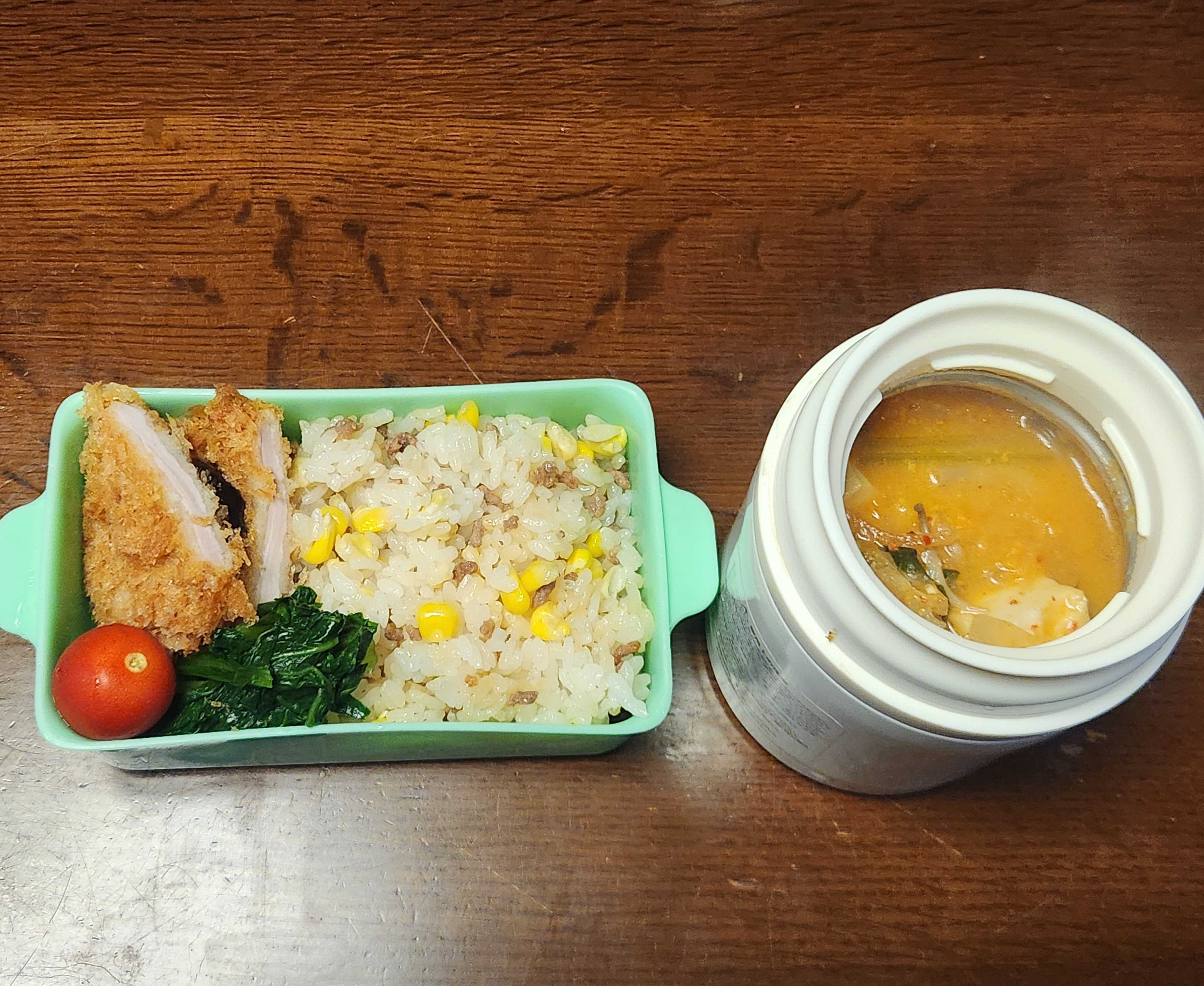 スープは、豆乳キムチスープ。今日も美味しかった😋今週も頑張ろう🎵