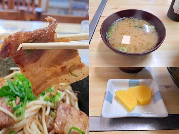 さぁ気になるお味です。。。もやしと一緒に焼き肉のタレ系の味で炒められた豚肉が、丼の表面を覆っています、、、豚肉の量もタップリでしょう!! その下にはキャベツの層があり、さらにその下がご飯です。。。タレは甘さ控えめでピリ辛、、、そのタレがキャベツやご飯にも染みています!! うんうん、旨い旨い~☆
