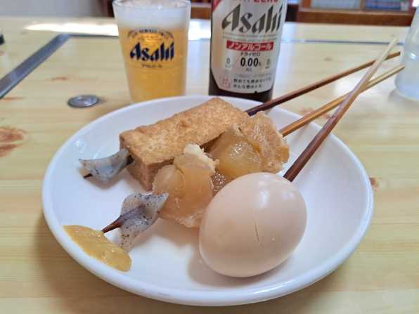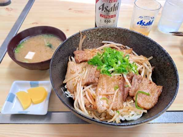 さて暖簾をくぐり入店すると、店内には3組位のお客さんです、、、私は一人でしたが4人掛けのテーブル席に着き、まずノンアルビールをお願いしました。。。そしてメニューを見ると、種類が豊富です、、、何にしようか迷いましたが、一番人気!と書かれている"豚辛丼"をお願いしました。。。また"おでん"も3本取って、それを食べながら待つこと約8分、、、"豚辛丼"のできあがりです。。。