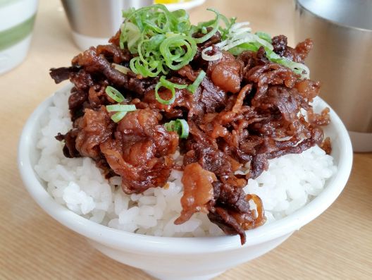 最後に、店内に漂っていた牛丼屋さんのような香りの正体であろう"牛めし"、、、待っている間、他のお客さんが多く注文していたので、メンバーのかっちゃんも頼んでいました。。。が、これも大変濃い味で、ご飯に醤油味の"牛佃煮"がトッピングされている感じです、、、なのでラーメンのセットでなく、これ単品でいただけるレベルでしょう。。。