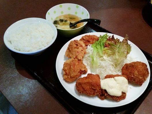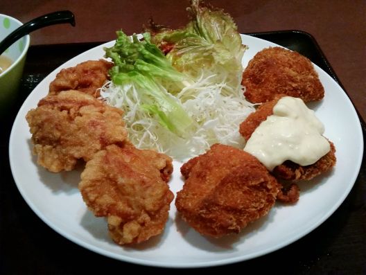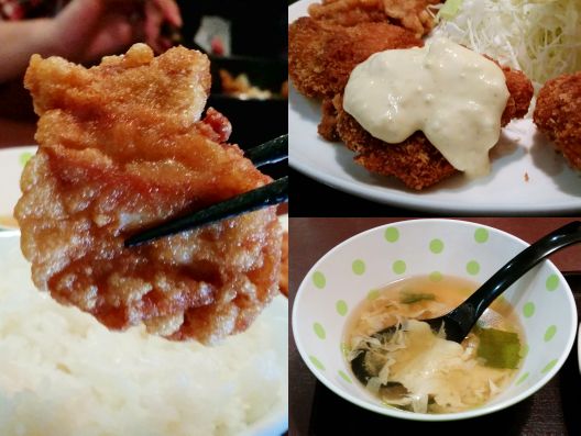 で、その大きな"カラアゲ"にかぶりつくと、、、中からジューシな肉汁がジュワっ!! と染み出してきます。。。ただ今多い味付け鶏肉ではなく、、、素の鶏肉を揚げている、昔ながらの"カラアゲ"と言う感じです。。。またタルタルソースのかかった"チキンカツ"の方は、衣がサクサク、、、と言うよりパリパリっ!! なので私的には"カラアゲ"の方が好きかなあぁぁぁ。。。うんうん、旨い旨い~☆