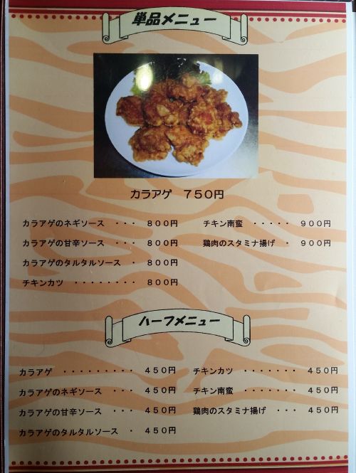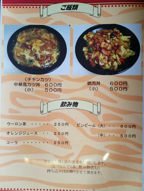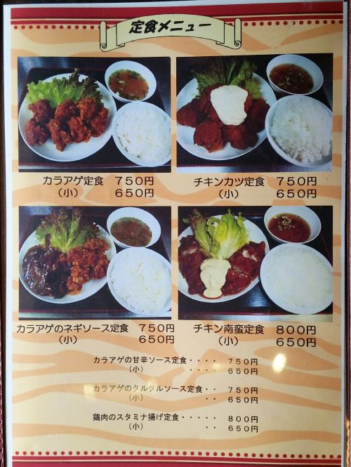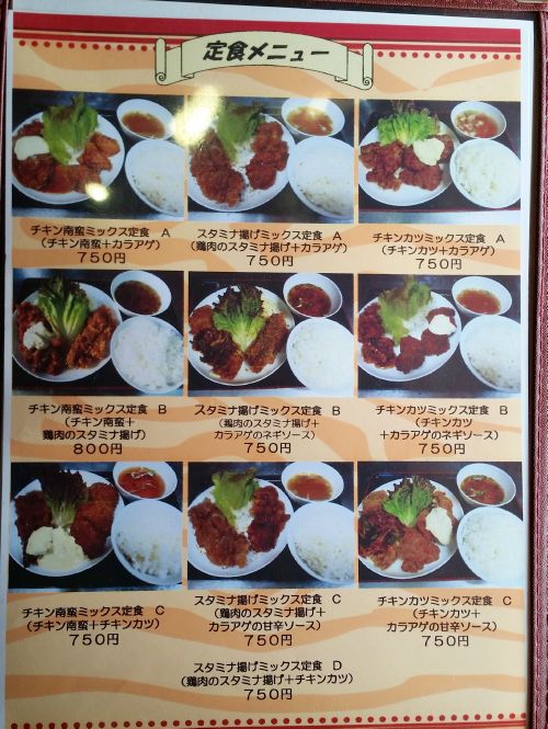 我々が店に到着したのは、お昼時の12時過ぎ、、、店内には家族連れなど、4、5組のお客さんが座っています。。。私と家内はテーブル席に着き、メニューを確認、、、私は"チキンカツミックス定食A(チキンカツ+カラアゲ)"を、家内は"焼肉丼(小)"を注文です。。。