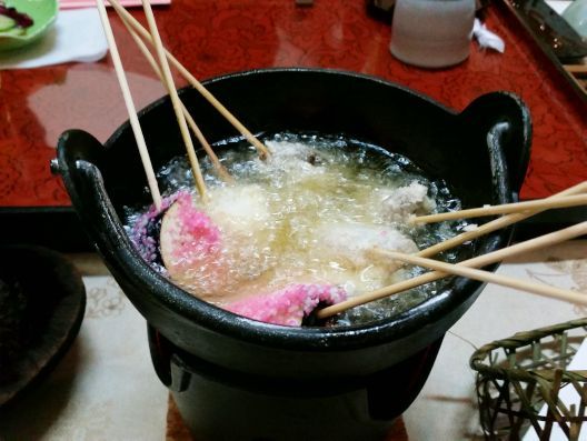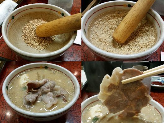 さて料理は前回とだいたい似ています、、、鈍川名物の"猪豚"は、紙鍋で煮込まれ、それを自分で擦った"白胡麻"の器でいただくのです。。。胡麻の香りがプンプンします!!