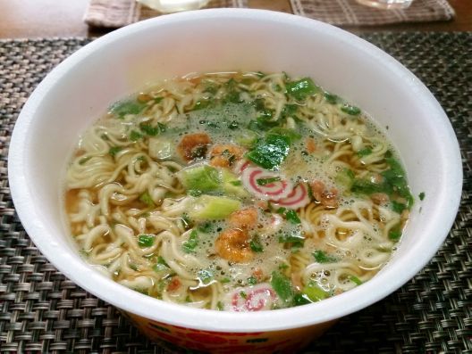 さてそのHPの 商品紹介 によると、、、『ポーク・チキンエキスをベースに、豚骨をブレンドし、隠し味にホタテ、カツオ、昆布など和風の旨味を配合したしょうゆスープです。かやくにえび、うずまきナルト、ねぎ、乾燥油脂を加えた、まろやかであっさりしたおいしさです。』と言うことです。。。熱湯をそそぎ3分、、、調味油を加えてできあがりです。。。