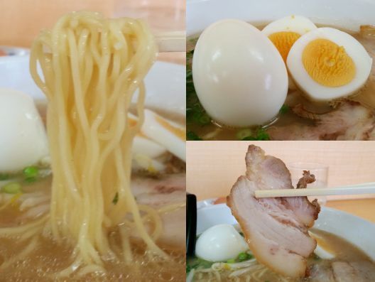 ありゃりゃ!? 出てきた"しようゆとんこつ"にも、ちゃんと"ゆで卵"がスライスされてトッピングされています、、、これはWトッピングになっちゃいましたねぇ。。。まぁいいか、、、気になるお味といきましょう。。。まず麺は細目で加水やや多めのウェーブ麺、、、シットリ食感で私的に好きなタイプです。。。しかも今回のゆで加減は、ほどよい固茹ででGOODでしょう!!