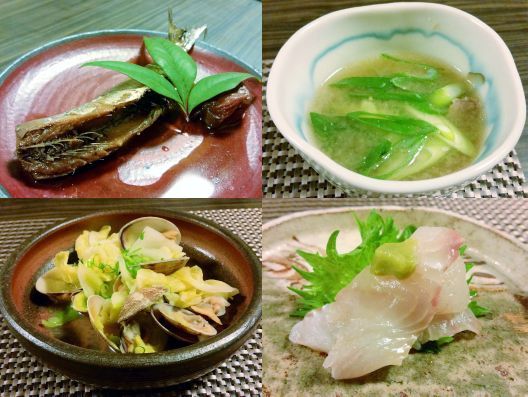[真いわし煮、ごぼう豚汁、あさりと春キャベツの酒蒸し、すずきあらい]