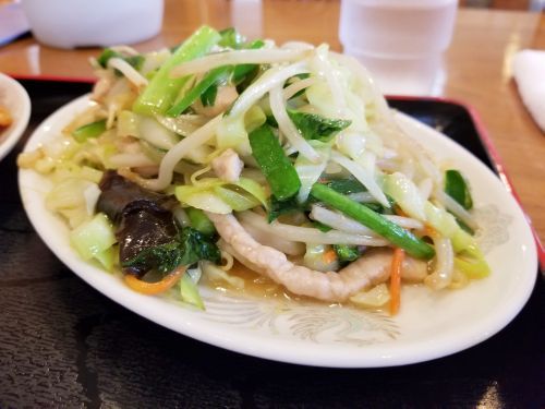 さぁ気になるお味です。。。まず"野菜炒め"は、細切りの豚肉、キャベツ、にんじんや、ニラ、青菜、もやし、木耳などの具材です、、、これが白いご飯によく合うのですねぇ。。。ガバっと取ってご飯にバウンド、、、ガツガツと口内にかき込みます!!
