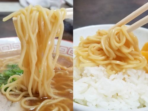 さて気になるお味は、この 過去記事 をご参照ください、、、まずは麺をオン・ザ・ライス、、、それを一緒にかき込んで、そこにスープを流し込みますねぇ。。。うんうん、旨い旨い~☆