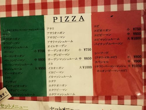 さて夕方6時頃の店内には、他にお客さんはいません、、、我々は中央辺りのテーブル席に着きました。。。そして注文なのですが、お昼のラーメンの量が多かったので、家内はお腹が空いていません、、、なので"ミックス大"と"アンチョビマッシュルーム中"を三人で分けることにしました。。。